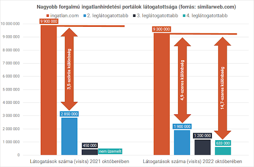 Ezt alátámasztja az is, hogy a similarweb.com szerint az ingatlan.com látogatottsága 2022 októberében elérte a 9.3 milliót, miközben november végén 195 ezer hirdetést találhattunk az oldalon. Ezek a számok jócskán meghaladják a következő három leglátogatottabb ingatlanportál összadatait, ráadásul az ingatlan.com látogatottságának részesedése még nagyobb volumenben nőtt az elmúlt egy évben.