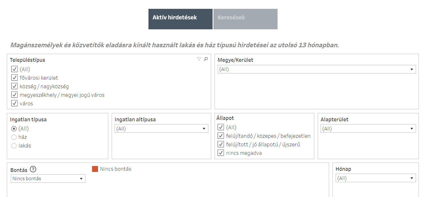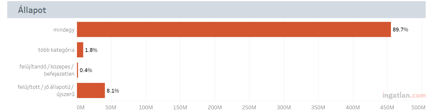 Az állapottípusok részletesebb kibontására azért nincs lehetőség, mert itt már nagyon alacsony számokkal tudunk dolgozni, amelyeknek nem feltétlenül van relevanciája. Például egy 0,4 %-os arányszám (a fenti képen: felújítandó/közepes/bejezetlen állapotokra szűrés arányszáma együttvéve) további bontása nagy valószínűséggel nem hordoz üzleti értéket.