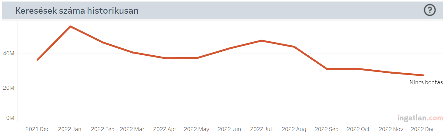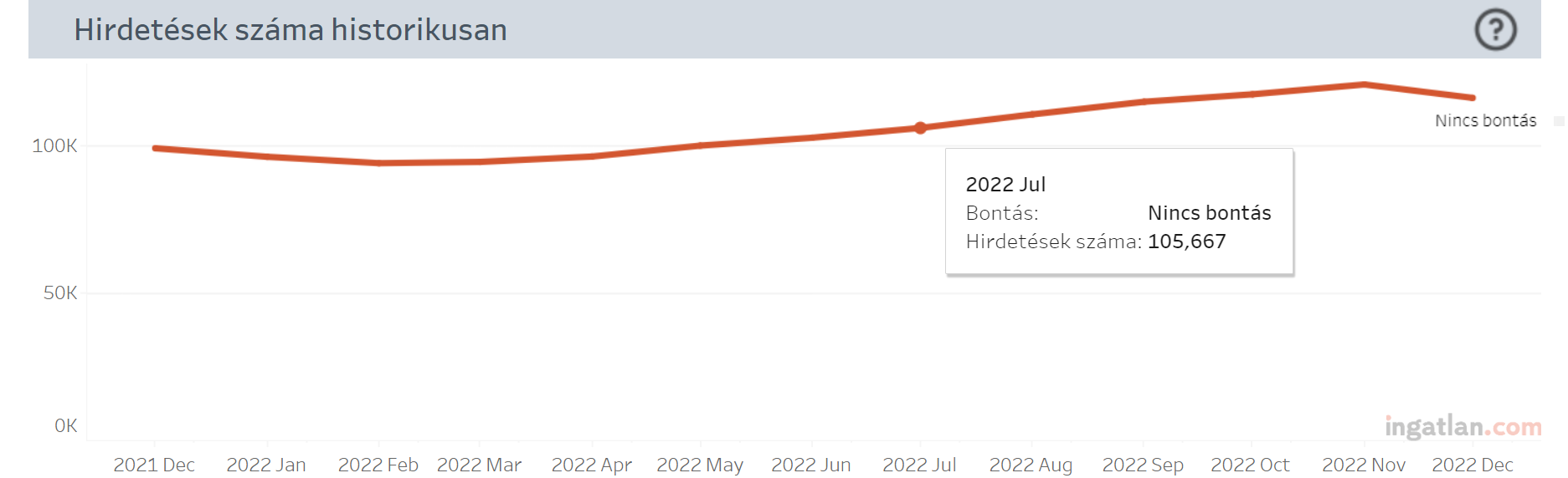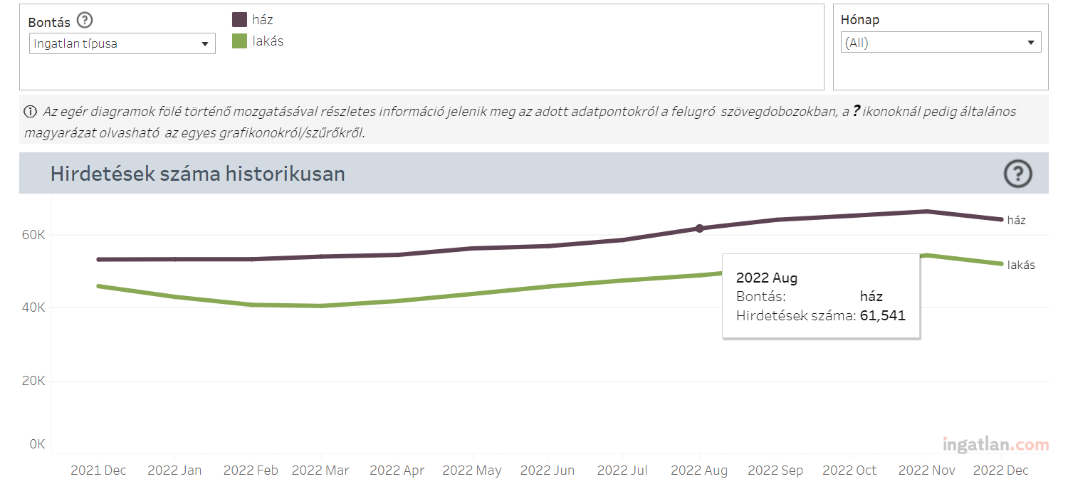 Itt az általad beállított szűrési paramétereknek megfelelően (például Vas megye családi házai) láthatod a hirdetésszám alakulását, az adott hónap utolsó napján aktív hirdetésekre vonatkozóan. A grafikon egy-egy pontjára húzva az egeredet, láthatod a pontos értékeket is.