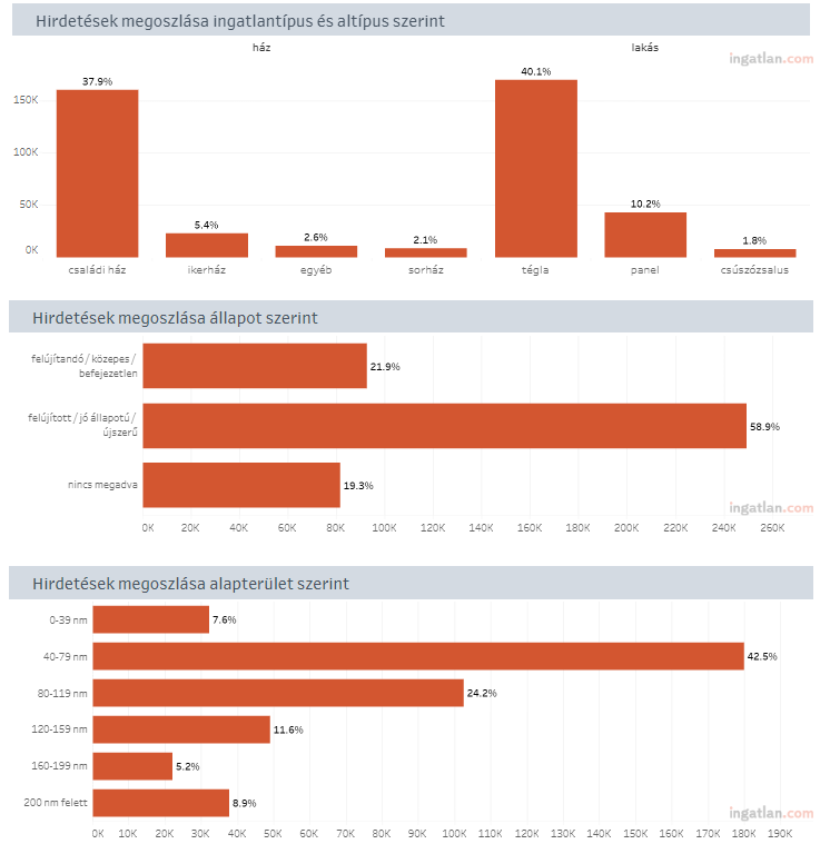 A hirdetések adatait több különböző paraméter alapján is feltüntetjük a grafikonokon. Ezeken látható, hogy a hirdetett ingatlanok hogyan oszlanak meg a különböző altípusokban, állapot szerint vagy alapterület alapján. Alapesetben a vizsgált 13 hónapra vonatkozó összes hirdetés adatait figyelembe vesszük ezeknél a grafikonoknál, így ha a legfrissebb adatokat szeretnéd látni, javasoljuk, hogy szűkítsd az időintervallumot a fent leírt módon.