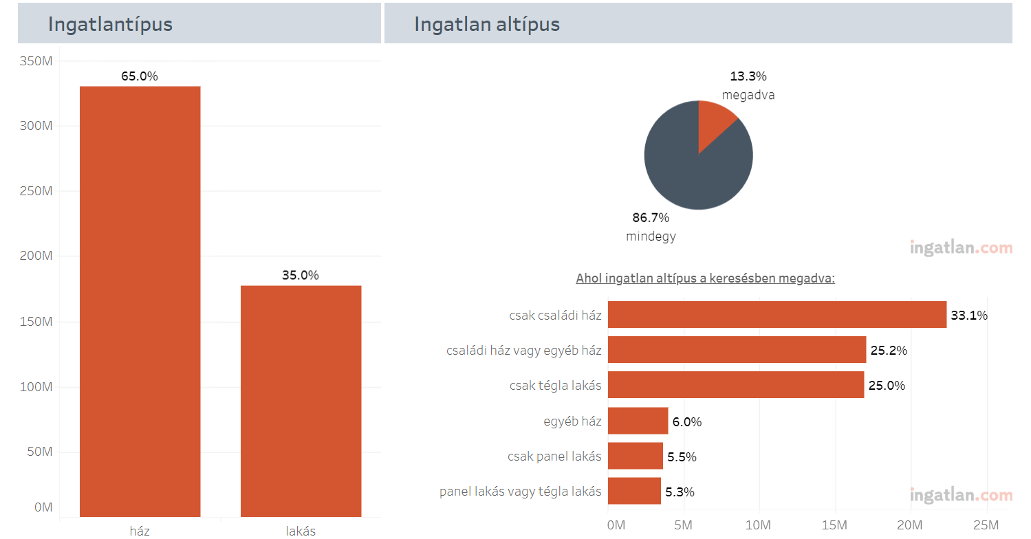 Amennyiben az ingatlantípusok szűrési paramétereinek beállításakor nem szűrtél arra, hogy “csak lakások” vagy arra, hogy “csak házak”, akkor az ingatlantípus szerinti megoszlásnál láthatod, hogy a keresések hány %-ában keresnek házat vagy lakást.