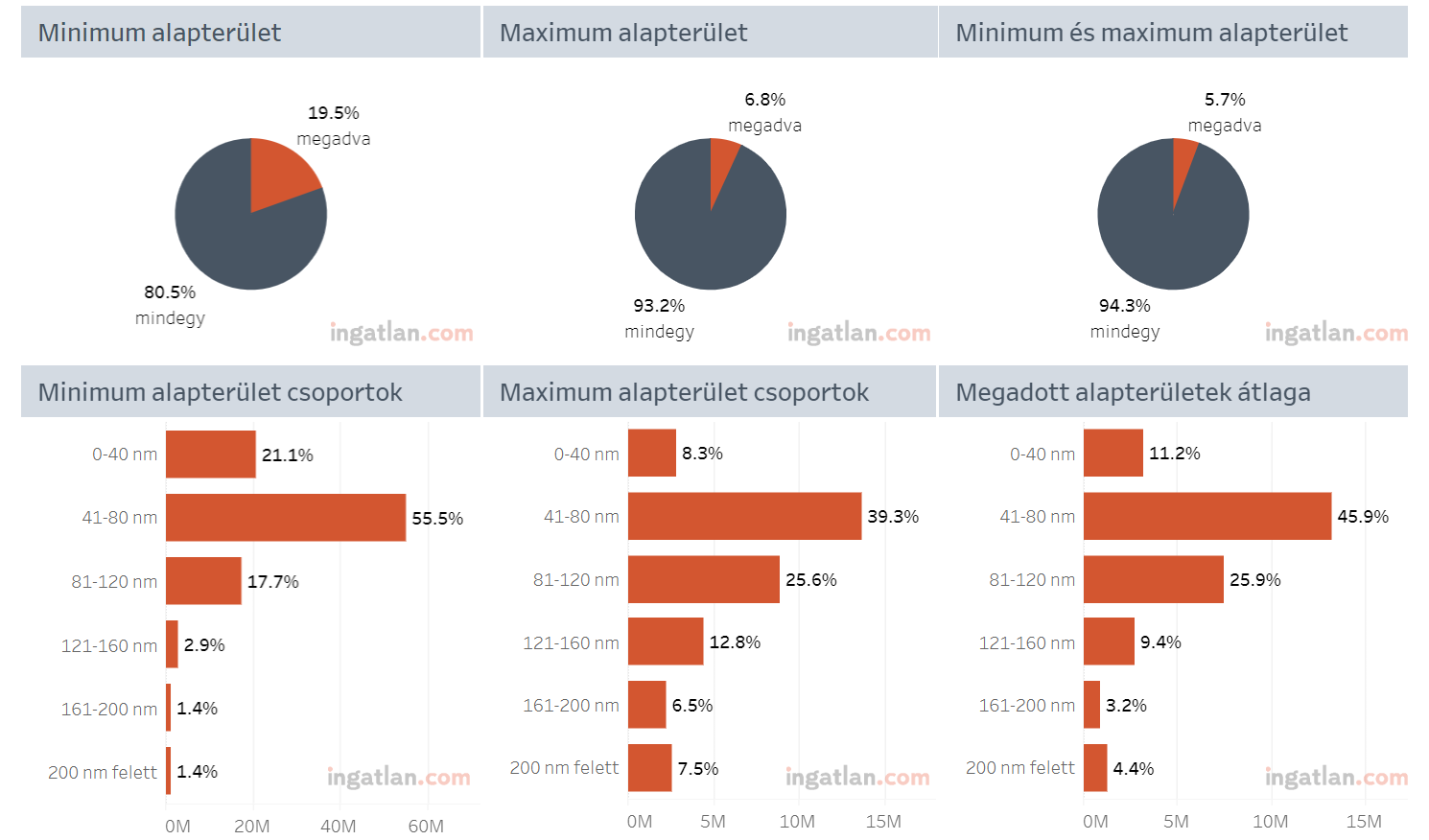 Az utolsó blokkban abba nyerhetünk betekintést, hogy a keresők hány százaléka szűr alapterületre és azon belül milyen értékeket adnak meg a kereséskor. A kördiagramok azt mutatják, hogy a keresések hány százalékában adtak meg minimum és/vagy a maximum alapterületet, az alattuk levő oszlopok pedig azt szemléltetik, hogy a kördiagramokon megjelenített értékek hogyan oszlanak meg az egyes alapterület-intervallumok között.