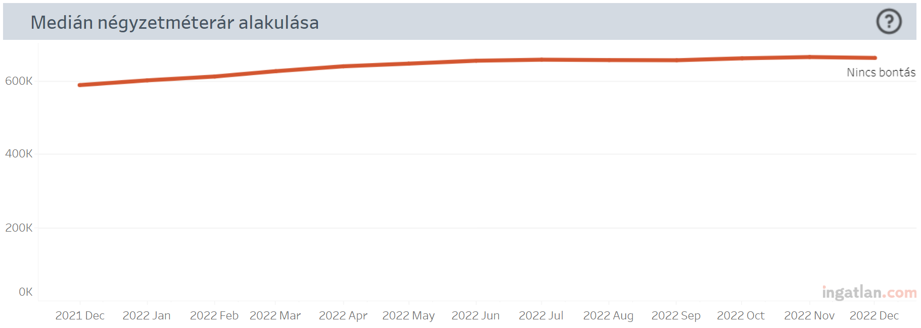 Módszertani okokból a számtani átlag helyett a medián értékét használjuk az “átlagos” árak meghatározására, mivel ez a statisztikai középérték jóval kevésbé érzékeny a szélsőségesen alacsony vagy magas értékekre. (Biztos te is találkoztál már olyan esettel, amikor egy nagyon alacsony vagy nagyon magas árú ingatlan jelentősen torzította a négyzetméterárakat egy-egy kerületben, városrészben, stb.) A medián gyakorlatilag a “középső” értéket jelenti, ezen a grafikonon azt az értéket (négyzetméterárat), amelynél alacsonyabb négyzetméteráron és amelynél magasabb négyzetméteráron ugyanannyi ingatlan került meghirdetésre.