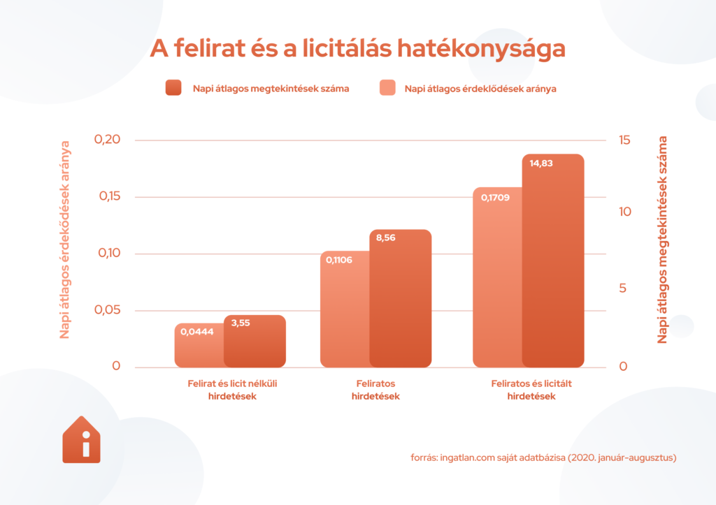 A színes feliratok nemcsak a hirdetéseden, de a listaoldalon is megjelennek, de azt is érdemes tudni, hogy a felirattól még nem sorolódik előbbre a hirdetésed. Erre érdemes inkább a licitálás funkciót választanod, a feliratok pedig inkább a figyelmet tudják felkelteni. Az ingatlan.com adatai szerint önmagában a felirat is kétszeres, háromszoros napi átlagos megtekintést és érdeklődést hozhat. Ha ehhez még hozzávesszük a liciteket is, akkor még jobb eredményeket lehet elérni. Tehát érdemes a két szolgáltatást együtt használni vagy olyan hirdetésnél alkalmazi a feliratot, amely licitálás nélkül is viszonylag elől helyezkedik el a találati listában.