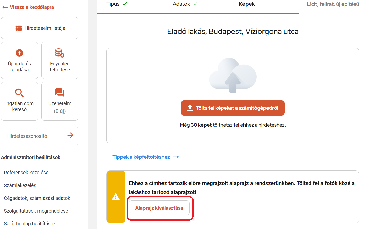 A hirdetésfeladás harmadik lépésében a képek feltöltésénél a rendszer előre jelzi számunkra, ha a hirdetéshez elérhető előre elkészített alaprajz.
