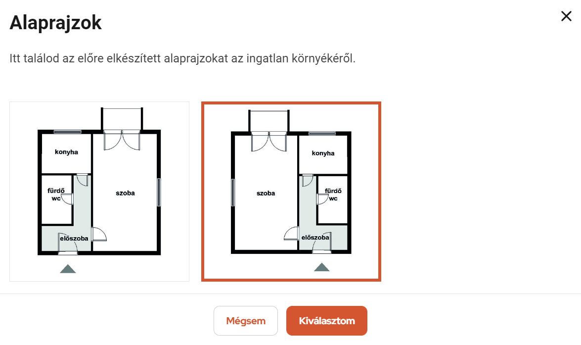 Az “Alaprajz kiválasztása” gombra kattintva egy külön ablakban megjelenik az ingatlanhoz tartozó összes elérhető alaprajz előnézete. Az alaprajzokat kattintással jelölhetjük ki, majd a “Kiválasztom” gomb segítségével tölthetjük fel a hirdetésünkhöz.