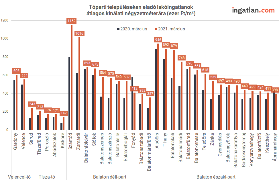 A balatoni árakból látszik, hogy az északi és a déli part között vannak eltérések, emellett sok esetben a fővároshoz mért távolság is befolyásolja az árat, a Budapesthez közelebb eső települések ugyanis jellemzően drágábbak. Az északi parton lévő települések esetében az átlagos négyzetméterár 675 ezer forintot tett ki. A legmagasabb ár Alsóörshöz köthető, ahol 946 ezer forint volt ez az érték, az egyik legalacsonyabb, 400 ezer forint alatti négyzetméterár pedig Ábrahámhegyet jellemezte. A Balaton déli partján, vagyis a Somogy megyei tóparti településeken az átlagos négyzetméterár 635 ezer forintra rúgott. A toplistát Zamárdi és Szántód vezeti több mint 1 milliós átlagos négyzetméterárral, a legolcsóbbak közé tartozik Balatonmáriafürdő, ahol négyzetméterenként 357 ezer forintot kérnek az eladók.