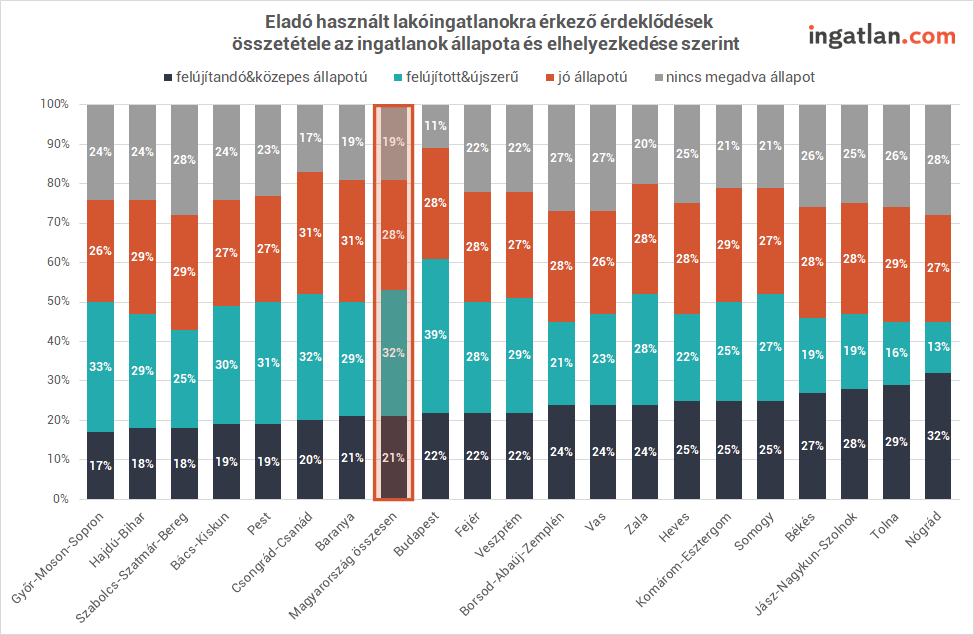 2020 augusztusa és szeptembere között az összes érdeklődés 21 százaléka érkezett eladó felújítandó ingatlanra, a felújított és újszerűek iránti kereslet az összes érdeklődés majdnem harmadát fedte le. A felújított vagy újszerű eladó ingatlanokra legnagyobb arányban Budapesten volt kereslet, ahol az összes érdeklődés 39 százaléka a legjobb állapotú lakásokra vagy házakra érkezett. A fővárost ebben a sorban Győr-Moson-Sopron és Csongrád-Csanád megye követi 33, illetve 32 százalékkal.