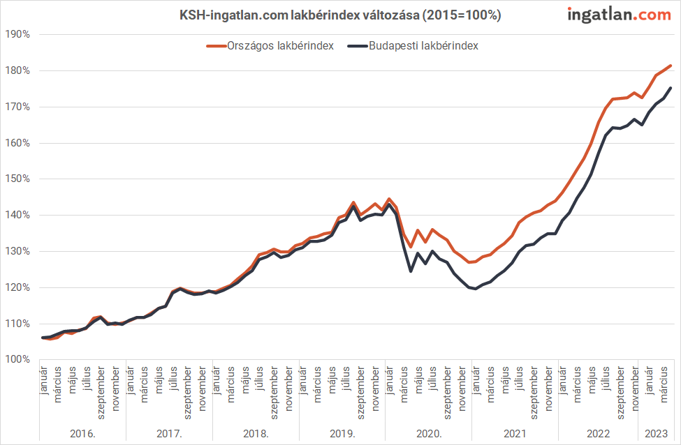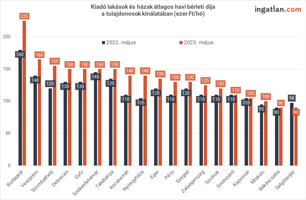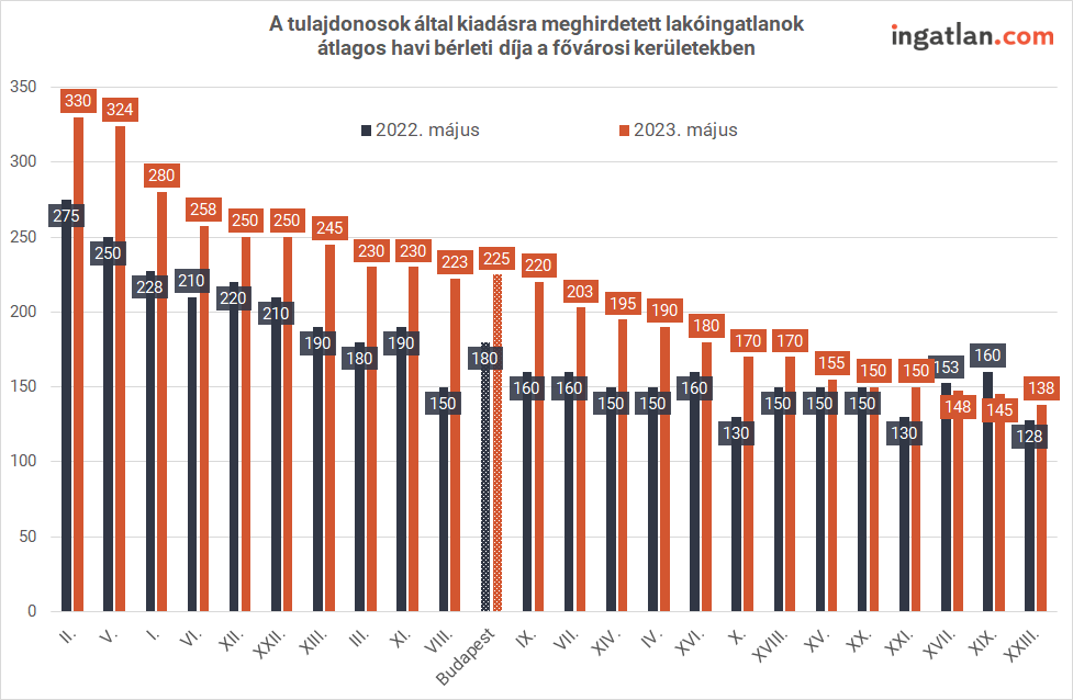 A májusi kínálati adatok is élénk albérletpiacra utalnak. Az ingatlan.com adatai szerint Budapesten 225 ezer forint volt az átlagos bérleti díj, szemben az egy hónappal korábbi 220 ezer és az egy évvel korábbi 180 ezer forinttal. A legnagyobb kínálatot felvonultató kerületek közül a XIII.-ban 245 ezer, a XI.-ben 230 ezer, a II.-ban átlagosan 330 ezer forintért hirdették kiadásra a lakásokat. Utóbbi kerület ezzel a bérleti díjjal átvette a legdrágább városrész címet az V. kerülettől, ahol május közepén 324 ezer forint volt az átlag. A legolcsóbb budapesti kerületekben, a XVII.-ben, a XIX.-ben és a XXIII.-ban átlagosan 138-147 ezer forintért kínálták a kiadó lakásokat.