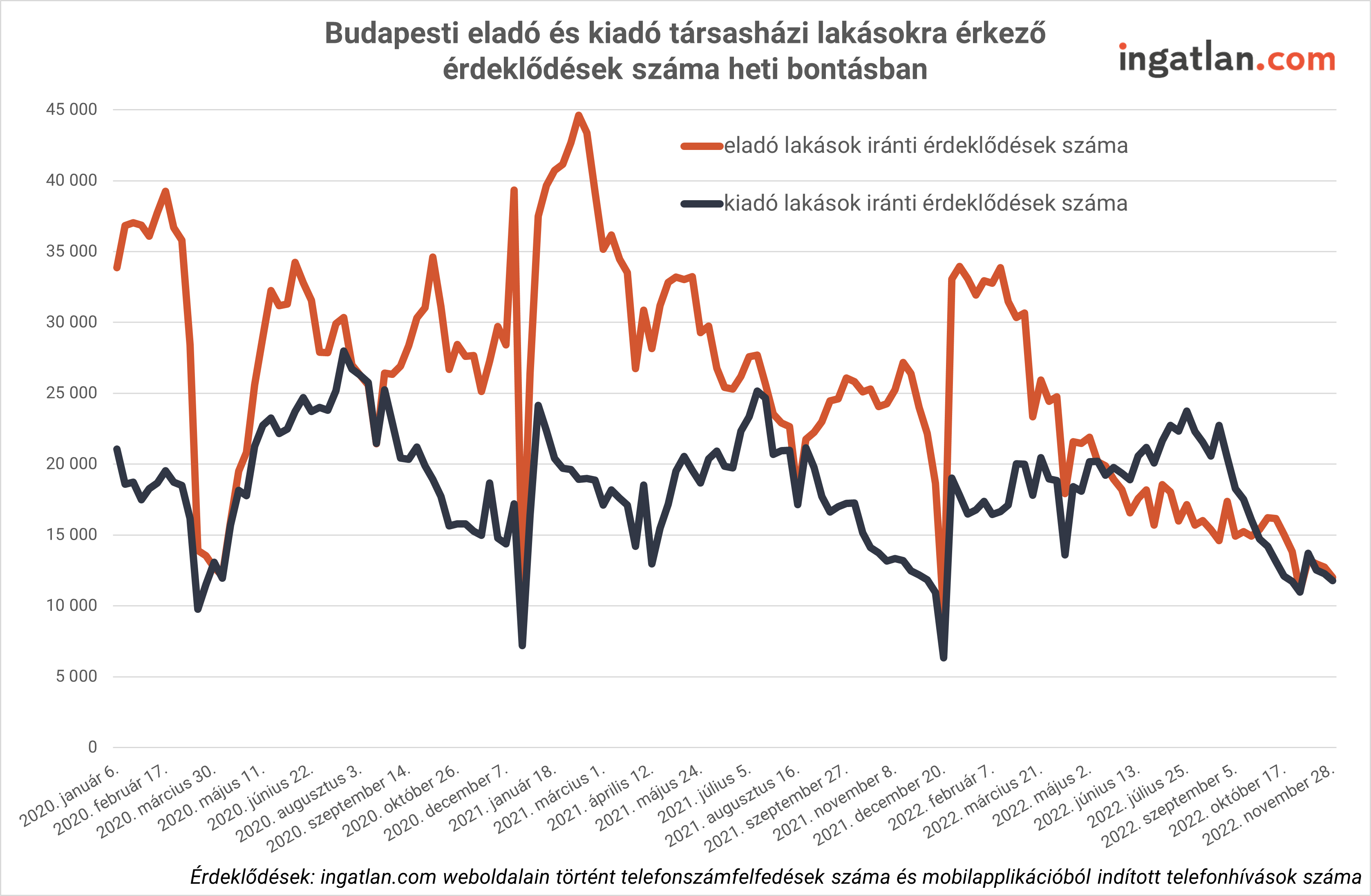 “November eleje óta lényegében azonos volt a budapesti társasházakban lévő eladó és kiadó lakások iránti kereslet. Ez új jelenségnek tekinthető ebben az időszakban. Már idén nyáron is meghaladta a bérelhető lakásokra érkező érdeklődések száma az eladó lakások keresletét országos viszonylatban, ami korábban nem fordult még elő. Erre viszont részben magyarázatot adott az albérletszezon intenzitása. Arra viszont utoljára a koronavírus-járvány idején volt példa, hogy a kiadó és eladó lakások iránti érdeklődések fej-fej mellett haladjanak egymáshoz képest. Fontos megjegyezni azonban, hogy egyelőre nem országos trendről van szó, csak a budapesti társasházi lakásokra igaz. A budapesti lakáspiac viszont sok esetben előre jelzi az országos folyamatokat.”