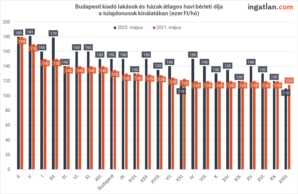 Május közepén Budapesten átlagosan 135 ezer forintos havi bérleti díjért kínálták a lakásokat a tulajdonosok, ami elmozdulást jelent az előző hónapra jellemző 130 ezer forintos szinthez képest. A díjelemelkedés elsősorban az drágábban kivehető új építésű lakások megjelenésének köszönhető. A használt lakásoknál ugyanis májusban 3000 forint volt az egy négyzetméterre vetített átlagos bérleti díj, ami ugyanakkora, mint áprilisban volt.