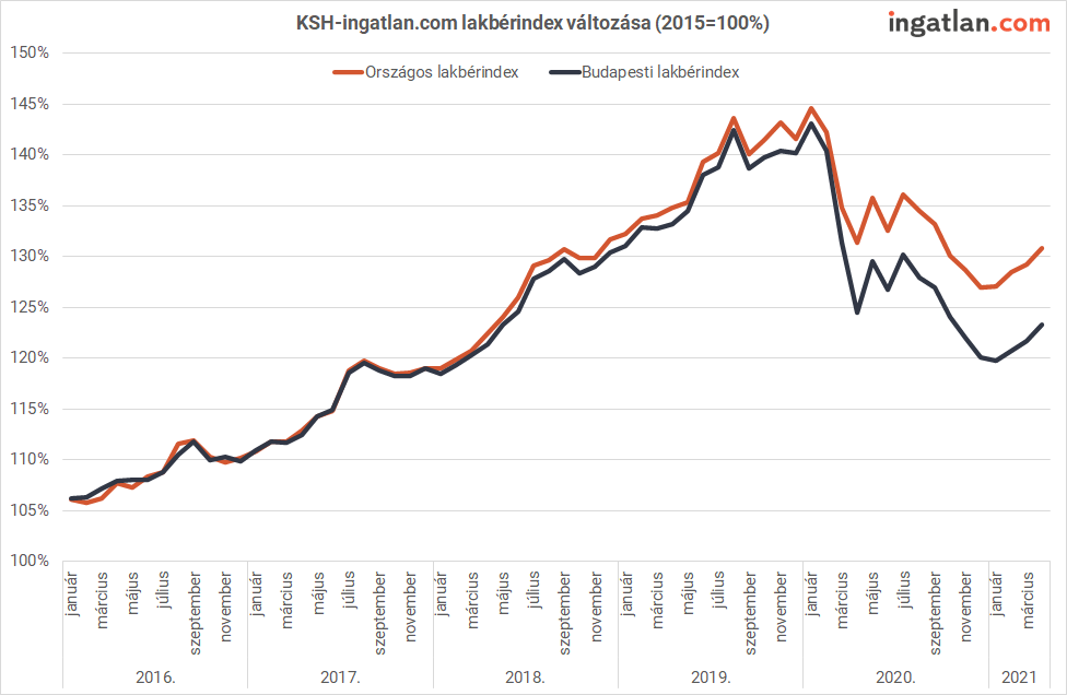 “Bár még mindig nem lehet tartós drágulásról beszélni, az egy évvel korábbi szinthez képest bekövetkezett változást tükröző indexek szerint a bérleti díjak fokozatosan dolgozzák le hátrányukat. Ez mutatja, hogy legutóbb tavaly márciusban volt emelkedés, azóta minden hónapban negatív volt a mutató. Az idén januárban még majdnem 13 százalékos, februárban majdnem 10 százalékos volt a visszaesés, márciusban már csak 5,5 százalékot tett ki, ezt követte az áprilisi 0,3 százalékos mérséklődés.”
