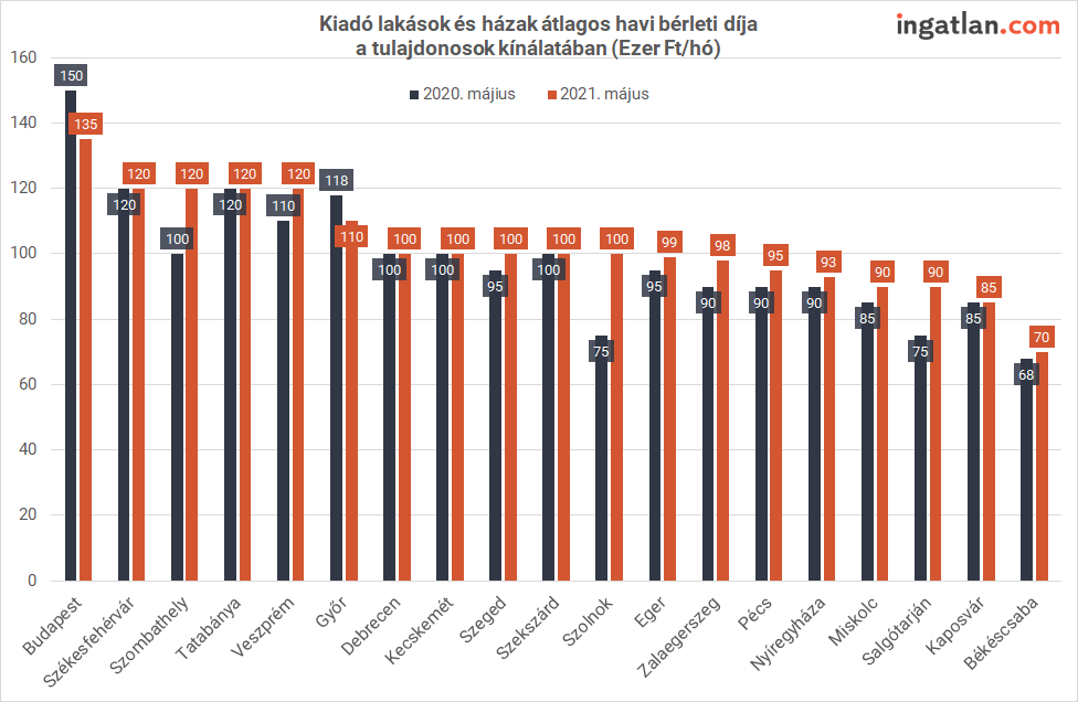 A teljes kínálat felemásan alakult, az ingatlan.com adatai szerint májusban több mint 20 ezer hirdetésben kínáltak kiadásra lakásokat országszerte a tulajdonosok és ingatlanközvetítők. Ez az egy évvel korábbihoz képest bővülést jelent, azaz nagyobb volt a választék, mint 2020 májusában, amikor a járvány miatt a hosszú távra kiadó lakáshotelek miatt megnőtt az albérletpiaci kínálat. Idén áprilishoz képest viszont május közepére szűkült a kínálat, amiben szerepet játszhat az, hogy sok tulajdonos tartalékol. Azaz várják az albérletpiac csúcsidőszakát, mivel a kereslet erejétől függően a felvételi ponthatárok kihirdetése után júliusban és augusztusban feljebb kúsztak az árak 2015 és 2019 közötti időszakban. A legfőbb kérdés, hogy idén nyáron hasonló lesz a trend, vagy pedig az éves összevetésben nagyobb kínálat miatt alacsonyabb szinten betonozódnak-e be a bérleti díjak. A bérlők egyelőre kedvező helyzetben vannak, mert tavalyhoz képest még mindig nyomottabb áron találhatnak kiadó lakást, ehhez viszont alaposan fel kell térképezniük a teljes kínálatot.