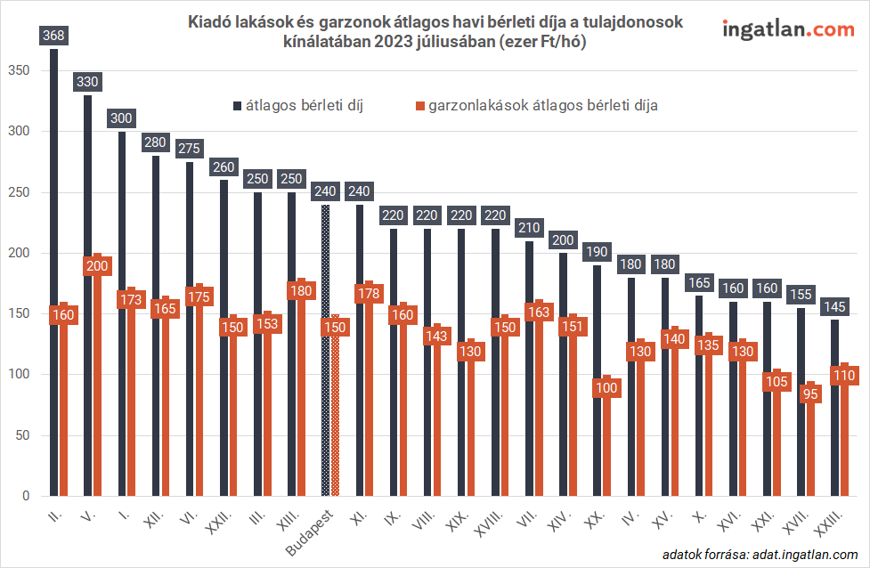 Az ingatlan.com adatai szerint Budapesten az albérleteket 240 ezer forintos átlagáron kínálják a bérlőknek. A 40 négyzetméternél kisebb garzonlakások esetében az átlagos lakbér jóval alacsonyabb, 155 ezer forint. A legnagyobb garzonkínálattal rendelkező városrészek közül a XI. és XIII. kerületben 177 és 180 ezer forint az átlag. A XVII., XX. és XXI. kerületben 100 ezer forint körüli összegért is kínálnak kiadó garzonokat. A fővárosban bérelhető szobák átlagos díja pedig 80 ezer forint, de kerülettől függően nagy különbségek lehetnek ebben is.