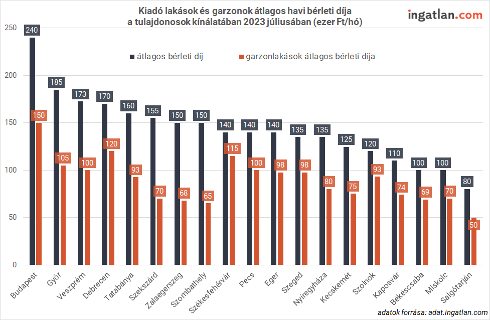A legnagyobb egyetemvárosok közül Győrben a 185 ezer forintos átlagos lakbérrel szemben a garzonok 105 ezer forintos bérleti díjjal szerepelnek a kínálatban, a szobák esetében 70 ezer forint az átlag. A debreceni albérletpiac 170 ezer forintos átlagos bérleti díjjal kezdi a szezont, míg a garzonokat 120 ezer, a szobákat 60 ezer forintos áron szerepelnek a kínálatban. Szegeden és Pécsen a 140 ezer és 135 ezer forintos átlagos díjhoz képest a 40 négyzetméternél kisebb lakásoknál 100 ezer, illetve 97 ezer forint a bérleti díj. Utóbbi városokban a kiadó szobák ára 60 ezer és 65 ezer forint. A miskolci garzonok 70 ezer forintos bérleti díja nem sokkal marad el a város teljes piacára jellemző 100 ezer forintos lakbérétől, a kiadó szobáknál 50 ezer forint az átlagos díj.