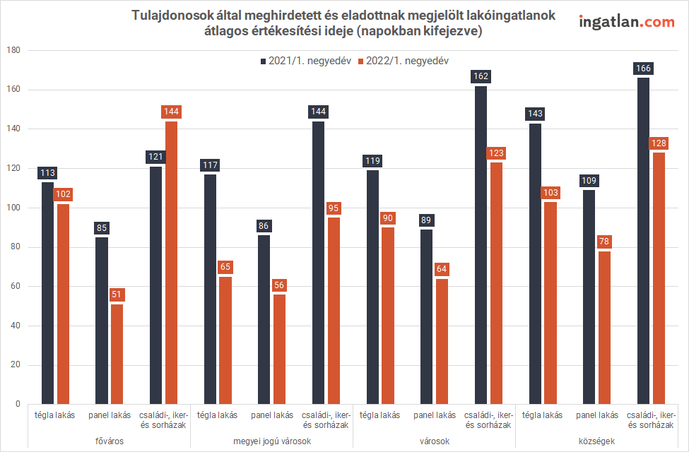 Az ingatlan.com elemzéséből kiderül, hogy Budapesten továbbra is a panellakások kelnek el a leggyorsabban. Balogh László szerint a lakótelepi lakások sikere nem meglepő, hiszen olcsóbbak a téglaépítésű társaiknál és a családi házaknál. Idén a fővárosi panelek már 51 nap alatt gazdára találtak a tavalyi első negyedév 85 napjával szemben. A téglaépítésű fővárosi lakások értékesítési ideje az idén 102 napra csökkent. Ugyanez tavaly átlagosan 113 napig tartott.