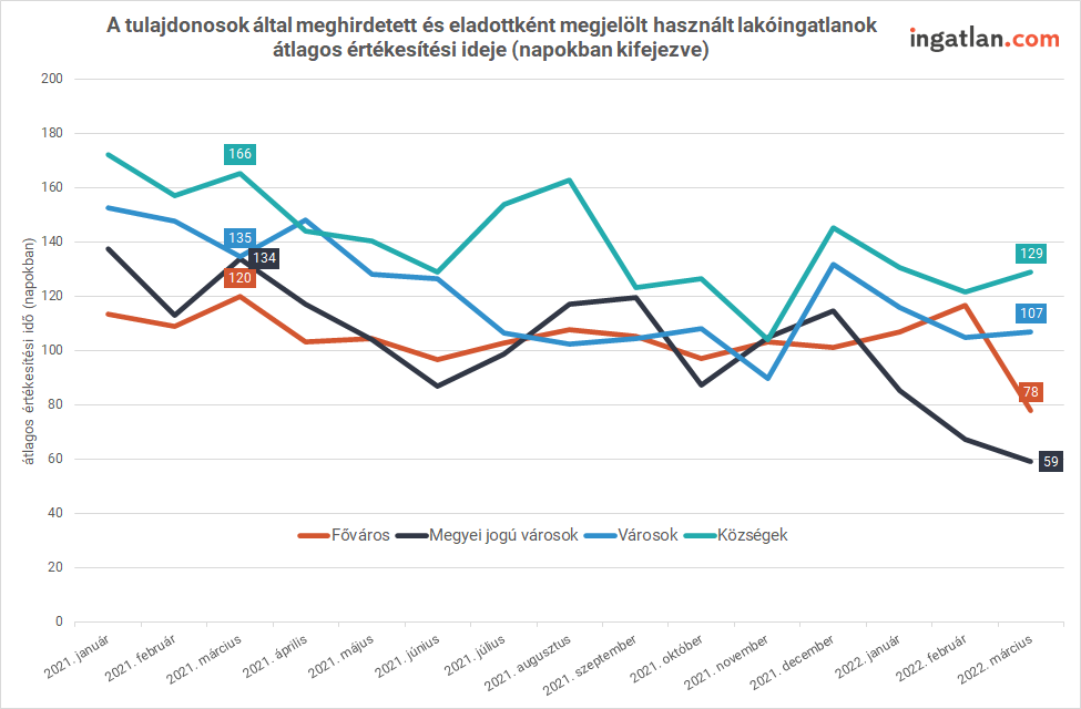 A kisebb városokban található lakásoknál a tavalyi 110 napról 82 napra csökkent az eladási idő, a családi házaknál pedig 162 napról 123 napra. A községek adatai nézve pedig kiderül, hogy az ottani házak 128 nap alatt elkeltek az idei adatok szerint, míg ugyanez 2021-ben több mint 166 nap alatt történhetett meg.