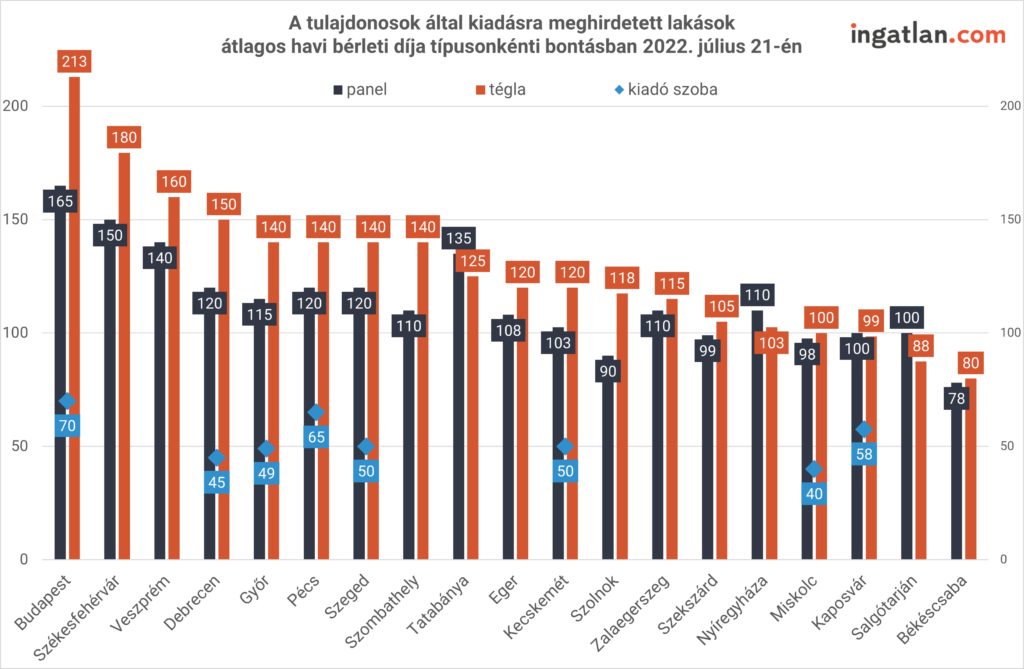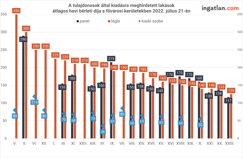 Budapesten a téglaépítésű kiadó lakóingatlanokat 125-350 ezer forintért kínálják. A különböző kerületeket nézve a VIII.-ban 185 ezer, a XI.-ben 190 ezer, a XI.-ben 210 ezer, a XIII.-ban pedig 200 ezer forint az átlag. A fővárosi kiadó panellakásokat 130-290 ezer forintos ár jellemzi. Az említett kerületekben pedig 150-215 ezer forintos átlagos díjjal várnak bérlőre a lakótelepi ingatlanok. A budapesti kiadó szobák esetében pedig 35 500 forinttól 118 500 forintig terjed a skála.