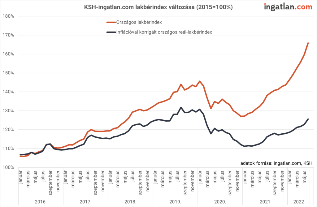 “Bár a bérleti díjak emelkedése kétségtelenül tempós, a hosszabb távú, inflációt is figyelembe vevő adatok azért mérsékeltebb drágulást mutatnak. 2015-höz képest az átlagos lakbérek országos szinten majdnem 66 százalékkal, a fővárosban 57 százalékkal emelkedtek júniusig a lakbérindex szerint. A KSH munkatársai az ingatlan.com adatai alapján azt is kiszámolták, hogy az inflációt is figyelembe véve az országos drágulás 26 százalékos, a fővárosi pedig 19 százalékos volt.” – értékelte a friss adatokat Balogh László, az ingatlan.com vezető gazdasági szakértője.