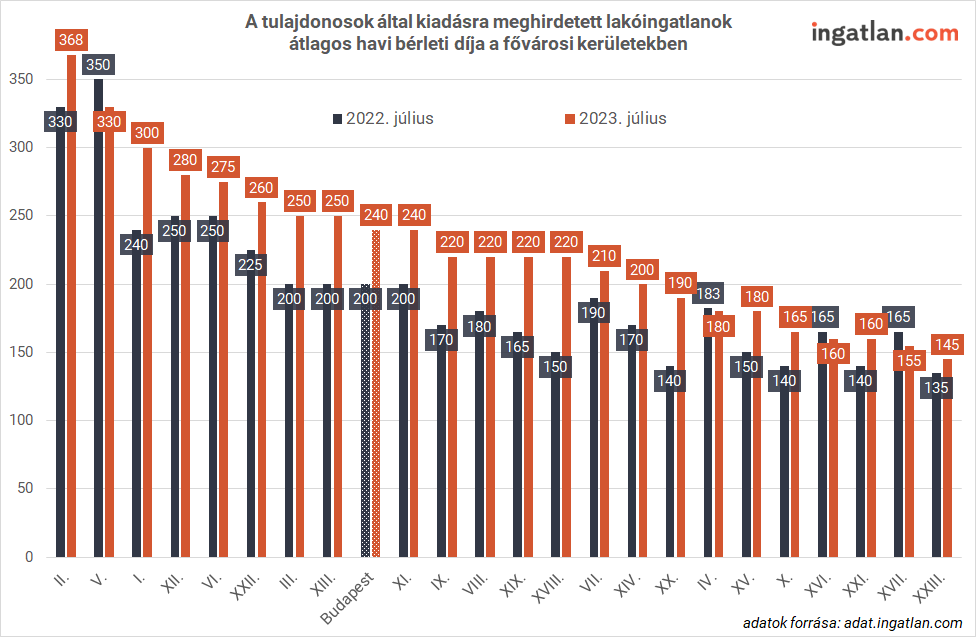 Az ingatlan.com adataiból az is kiderült, hogy a felvételi ponthatárok szerdai kihirdetése előtt – július végén – milyen átlagáron szerepeltek a kiadó lakások a kínálatban. Budapesten 240 ezer forint volt az átlagos bérleti díj. A legnagyobb választékkal rendelkező városrészeket, köztük a III., VIII., XI. és XIII. kerületet 220-250 ezer forintos átlagos bérleti díj jellemezte. A legdrágább kerületek közé tartozik az I., a II. és az V. 300-368 ezer forinttal. A legolcsóbbak között van például a XVI., a XVII., a XXI. és a XXIII. kerület, ahol 145-165 ezer forintos átlagos lakbérrel találkozhatnak a bérlőjelöltek.