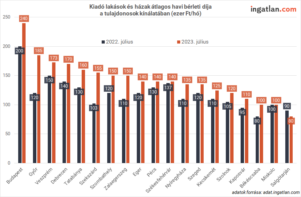 A legnagyobb egyetemvárosok közül Győrben 185 ezer, Veszprémben több mint 172 ezer, Debrecenben 170 ezer forint az átlag a mostani kínálatiot nézve. Ennél valamivel olcsóbb városnak számít Pécs és Szeged a maga 140 ezer és 135 ezer forintos átlagos bérleti díjával. Miskolcon pedig 100 ezer forintos összeggel várja a szezon indulását.