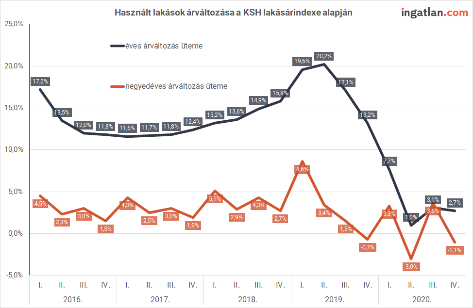 Elkészült a több szempontból is rendhagyónak mondható 2020-as év lakáspiaci bizonyítványa. Az év végén csökkent a használt lakások ára, a negyedik negyedévben a harmadikhoz képest 1,1 százalékos volt a mérséklődés – derül ki az ingatlan.com hivatalos lakásár-adatokon alapuló elemzéséből, amely 130 ezer lakóingatlan hirdetés alapján azt is bemutatja, hogy április közepén milyen átlagos négyzetméterárak jellemezték a nagyvárosokat.