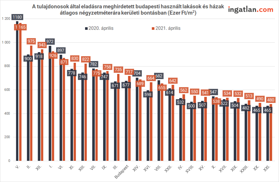 Az ingatlan.com elemzéséből kiderül az is, hogy április közepén a fővárosban az eladásra kínált lakóingatlanok átlagos négyzetméterára 717 ezer forintot tett ki, miközben éves szinten hét kerületben is csökkentek az árak. A különböző városrészek közül az V. kerület volt a legdrágább, ahol átlagosan 1,18 millió forintért kínálták eladásra a lakóingatlanok négyzetméterét. A legolcsóbb kerület pedig a XXI., Csepelen az átlagos négyzetméterár 480 ezer forint volt.