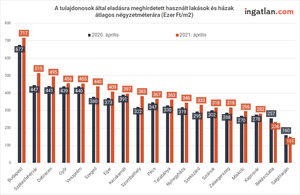 Az ingatlan.com elemzése szerint az idén erősödött a kereslet a használt lakások piacán, különösen az év első két hónapjában. A keresleti oldal erősödése legnagyobb mértékben a 2021-ben életbe lépett otthonteremtési támogatásoknak köszönhető, illetve annak, hogy vásárlók a járványhelyzet miatt nagyobb alapterületű ingatlanokat keresnek. Ezeket viszont leginkább a nagyvárosok külső kerületeiben vagy agglomerációs övezeteiben találják meg, ahol jellemzően alacsonyabbak a négyzetméterárak.