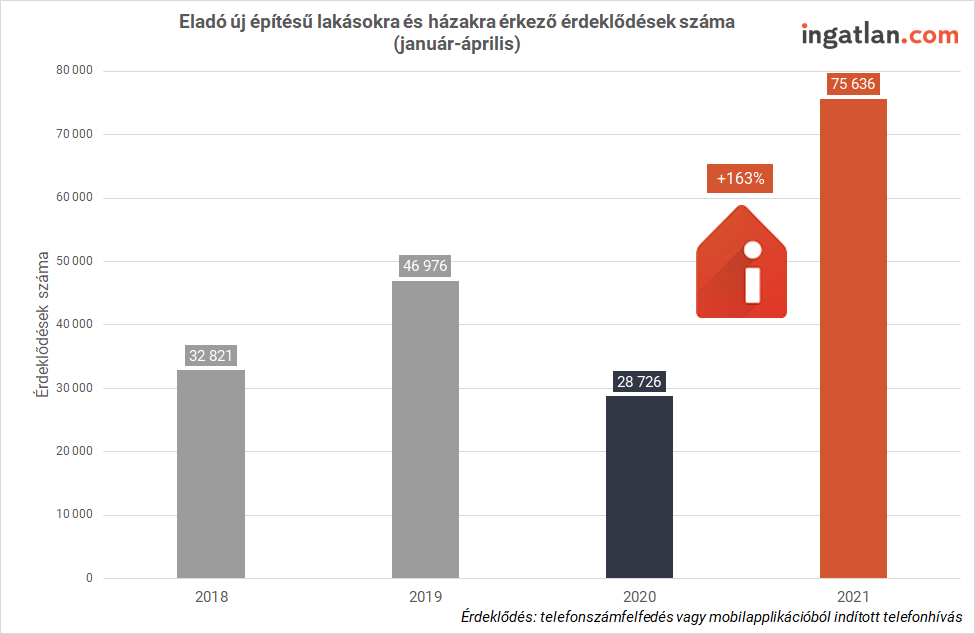 Az új lakások iránt az ingatlan.com adatai szerint nagyon megugrott az érdeklődés ebben az évben. Az idei év első négy hónapjában 163 százalékkal többen érdeklődtek az eladásra kínált új lakóingatlanok iránt, mint egy évvel korábban.