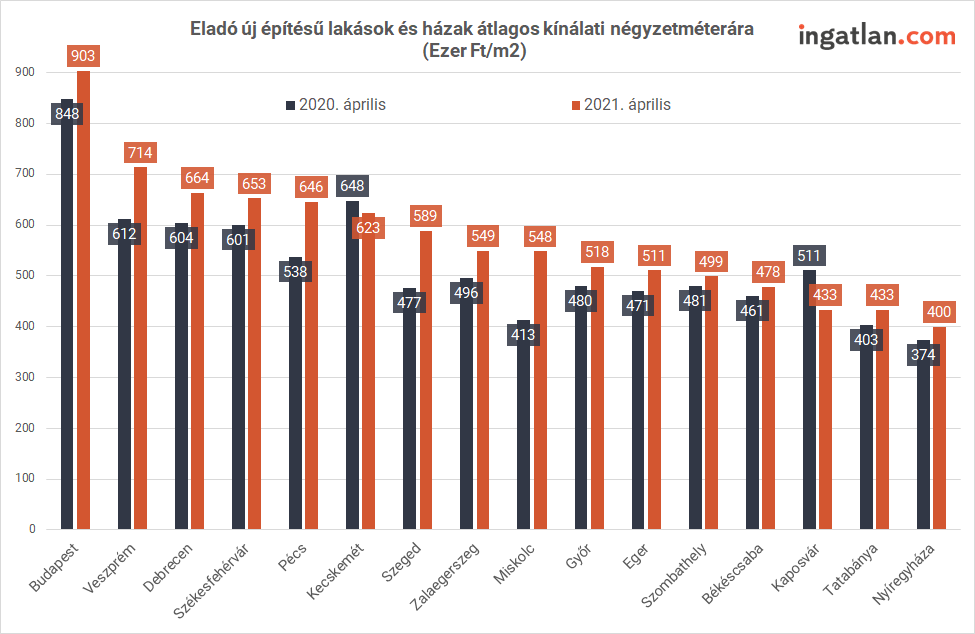 Áprilisban a fővárosi új lakóingatlanok átlagos négyzetméterára 903 ezer forint volt. A megyeszékhelyek közül Debrecenben 664 ezer forintba került az eladásra kínált új lakóingatlanok négyzetmétere. Pécsen ugyanez 646 ezer forintot, Kecskeméten 623 ezer forintot, Győrben pedig 518 ezer forintot tett ki. Nyíregyházán négyzetméterenként kereken 400 ezer forintért hirdették eladásra az új lakásokat és házakat.