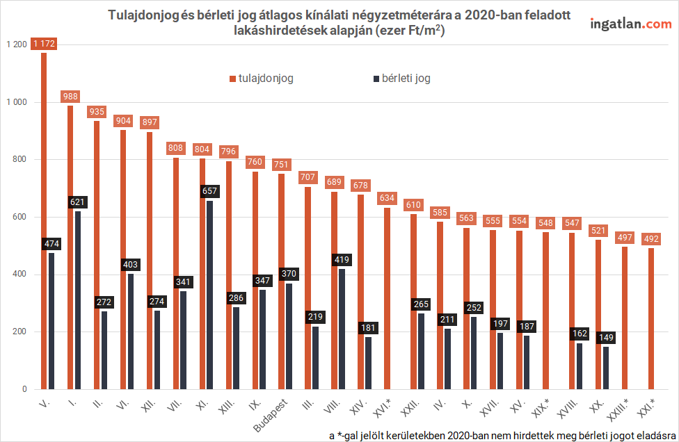 Az ingatlan.com elemzése szerint egy négyzetméterre vetítve nagyságrendileg a tulajdonjog feléért lehetett bérleti jogot vásárolni a nagyvárosokban. Tavaly Budapesten a bérleti jogok kínálati négyzetméterára átlagosan 370 forint volt, ami az 52 százalékát tette ki a tulajdonjogra vonatkozó 751 ezer forintos átlagos négyzetméterárnak. Az I. kerületben, ahol viszonylag sok a bérleti jogos lakás, 63 százalékos az arány. Tulajdonjog vásárlása esetén ugyanis tavaly majdnem 988 ezer forint az átlagos négyzetméterenkénti kínálati ár, miközben bérleti jog esetében 621 ezer forintot kértek a hirdetők.