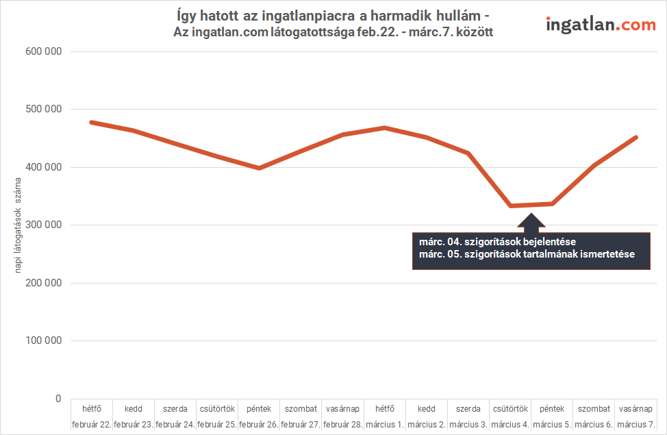 “A szigorítások bejelentése után óráról-órára csökkent az érdeklődés az eladó és kiadó lakások iránt. Heti összevetésben 20-25 százalékos volt a visszaesés csütörtökön és pénteken. Vasárnap azonban már kezdett visszaállni a kereslet a március elején megszokott szintre.”