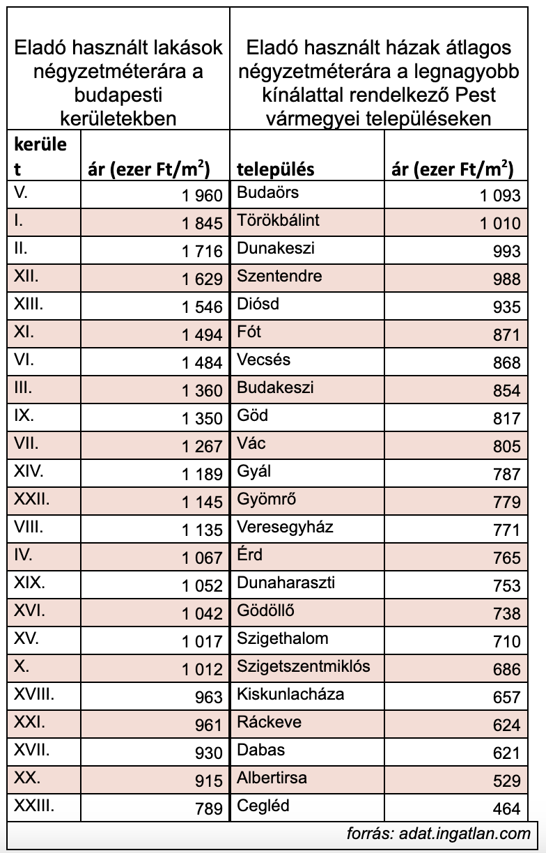 A budapesti és a vonzáskörzet négyzetméterárai között kialakult különbség miatt ismét reálissá vált budapesti lakásból agglomerációs kertes házba költözni. A budapesti eladó használt lakások átlagos négyzetméterára ugyanis 1,38 millió forintnál jár, miközben Pest vármegyében az eladó használt kertes házak négyzetméterára átlagosan 712 ezer forint.