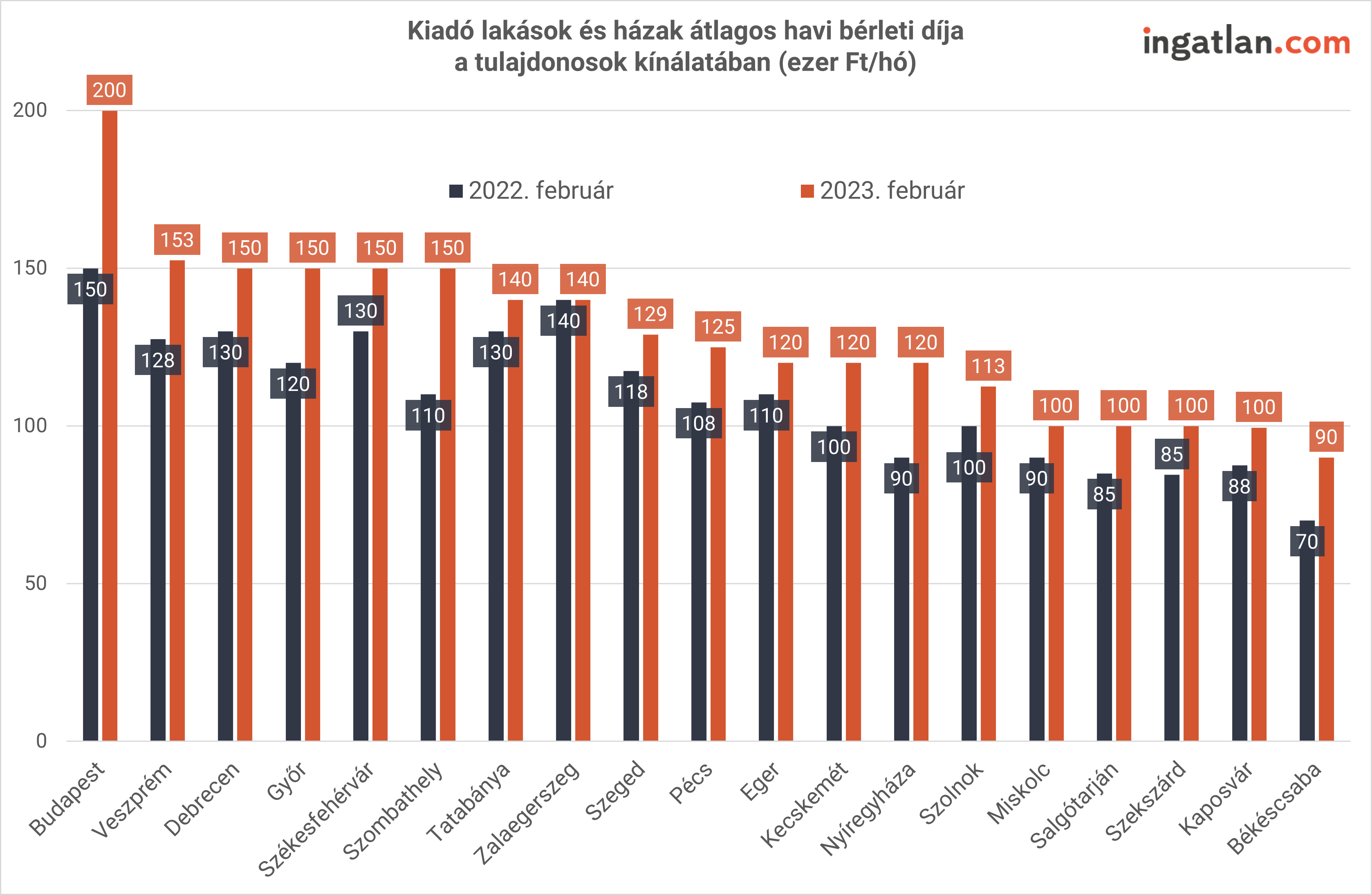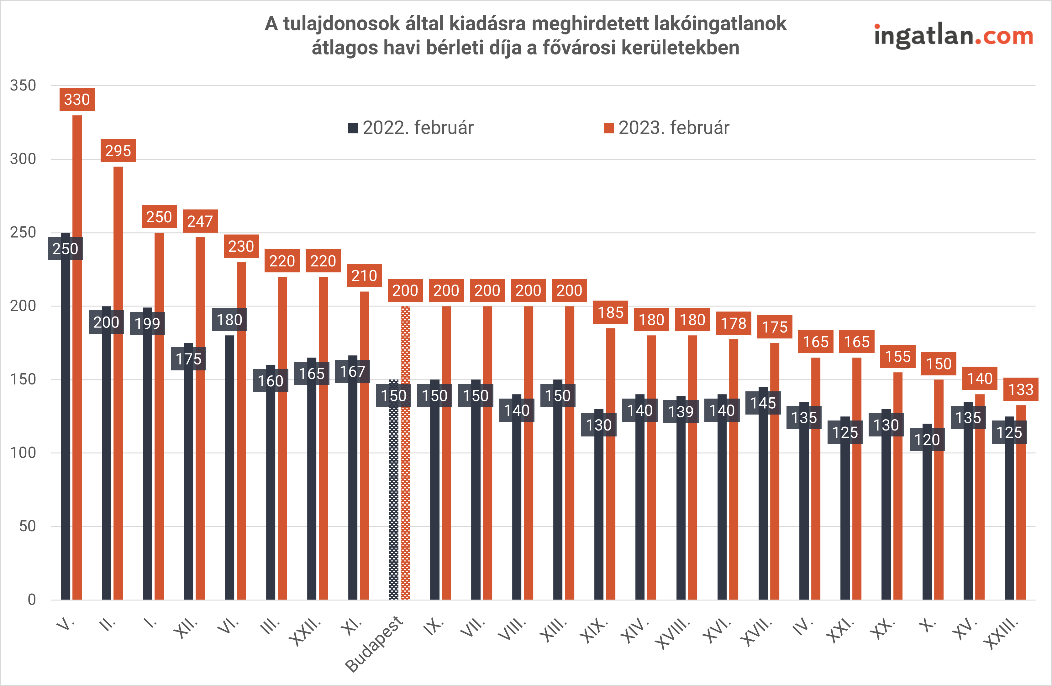A fővárost február közepén 200 ezer forintos átlagos bérleti díj jellemezte. Az V. kerületben a legmagasabbak a bérleti díjak, átlagban 330 ezer forintért kínálják a kiadó lakásokat. Utána az II. és az I. kerület jön 295 ezer és 250 ezer forintos összeggel. A három legolcsóbb városrészben feleennyiért lehet lakást bérelni. A X., a XV. és a XXIII. kerületben 132-150 ezer forintos bérleti díjjal találkozhatnak a bérlőjelöltek.