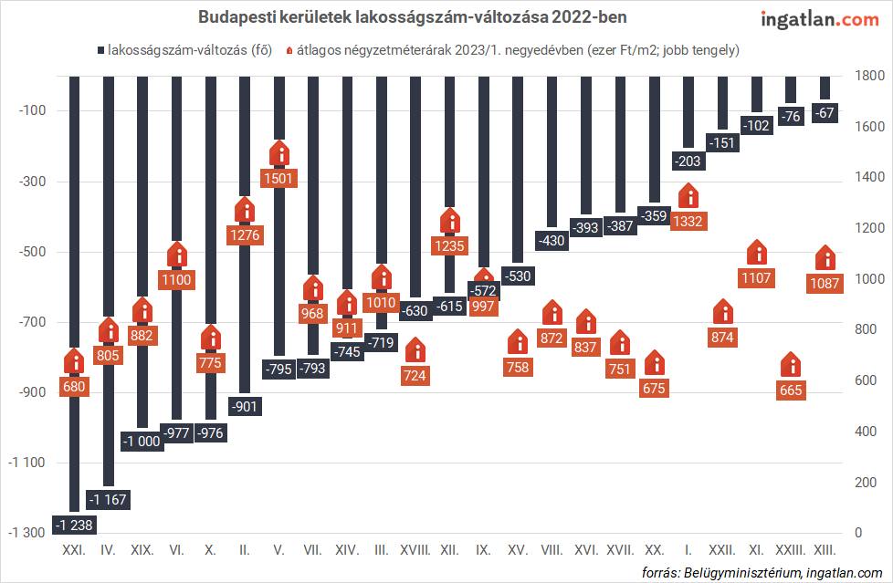 A másik végletet vármegyeszékhelyek és a budapesti kerületek képviselik. A fővárosi összlakosságszám tavaly 13 ezer fővel továbbcsökkent 1,63 millióra. Budapest IV. és XXI. kerületében, Pécsen, Szegeden, Debrecenben és Miskolcon 1133-2259 fővel lettek kevesebben. Az ingatlanok a lakosok számának visszaesése ellenére drágultak, az átlagos négyzetméterár ugyanis ezekben a városokban és kerületekben 14-21 százalékkal népesség, a kínálati árak ugyanakkor így is 13-21 százalékkal emelkedni tudtak, mégpedig 435-729 ezer forintra. “A lakosságszám-csökkenést elkönyvelő budapesti városrészek és vármegyeszékhelyeken bekövetkező lakásdrágulás azzal magyarázható, hogy az arányokat tekintve mindössze 1 százalék körüli mértékben esett vissza a népesség, így marad kereslet az ottani lakásokra. Ráadásul a budapesti kerületek és az egyetemvárosok a befektetési célú vásárlók kedvelt célpontjai, ami pedig felfelé húzza vagy megtámasztja az árakat” – fogalmazott Balogh László.