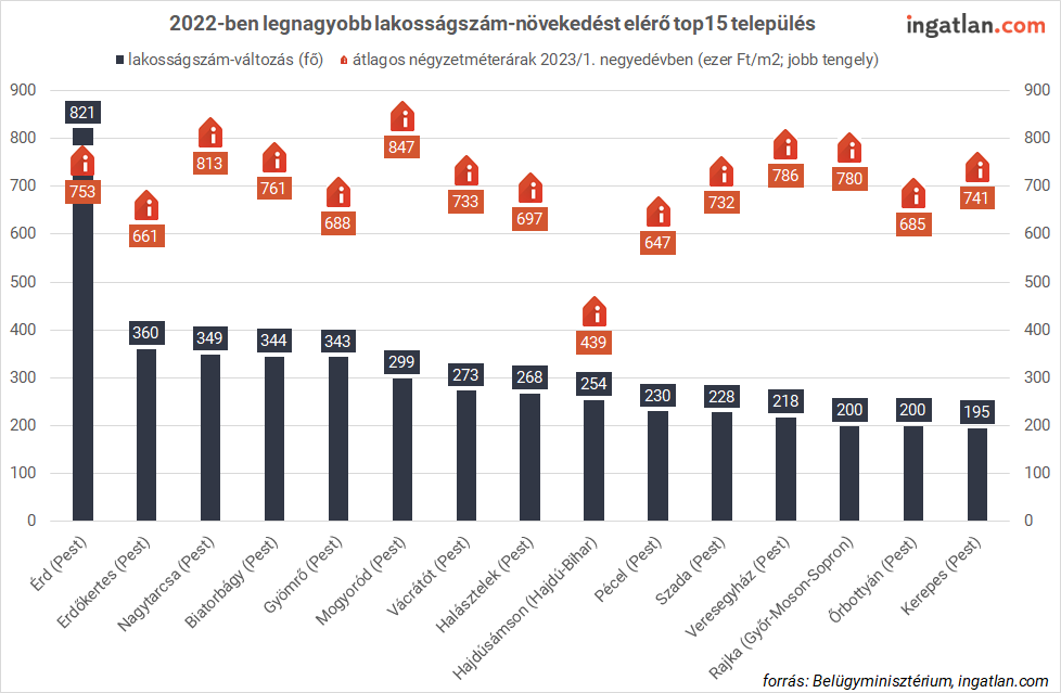 Egy év alatt Érd lakossága 821 fővel nőtt, ezzel a budapesti agglomeráció egyik legnagyobb városa vezeti az országos rangsort. Az érdi átlagos négyzetméterárak a kínálati piacon pedig egy év alatt 16 százalékkal 753 ezer forintra emelkedtek. Érd után további budapesti agglomerációs települések következnek: a Pest vármegyei Erdőkertesen, Nagytarcsán, Biatorbágyon és Gyömrőn 343-360 fővel nőtt a lakosság. A szóban forgó településeken az átlagos négyzetméterárak 4-21 százalékkal 661-813 ezer forintra emelkedtek. A lakosságszám szerinti változását nézve a top 10-ben szerepel még többek között a szintén Pest vármegyében lévő Vácrátót, ahol a lakosság 12 százalékos bővülését 17 százalékos drágulás kísérte, így a négyzetméterárak 733 ezer forintra nőttek. A legjobb tízben az egyetlen nem Pest vármegyei település Hajdúsámson, a Debrecen vonzáskörzetében található településen a lakosok száma 254 fővel bővült, az átlagos négyzetméterárak pedig 15 százalékkal 439 ezer forintra emelkedtek.