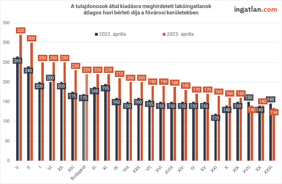 Az ingatlan.com elemzése ismerteti azt is, hogy miként alakultak az albérletárak április végén. Budapest 220 ezer forintos bérleti díjjal zárja ezt a hónapot, ami 10 ezer forinttal haladja meg a márciusi végi szintet. A legdrágább városrész továbbra is az V. kerület 320 ezer forintos átlaggal. A II. kerület 300 ezer forinttal áll a második helyen, a harmadikon holtversenyben van az I., a VI. és a XII. kerület egyaránt 250 ezer forintos átlagos lakbérrel. A legolcsóbban havi 134-140 ezer forintért a XVII., a XX. és XXIII. kerületben vehetnek ki lakást a bérlőjelöltek.