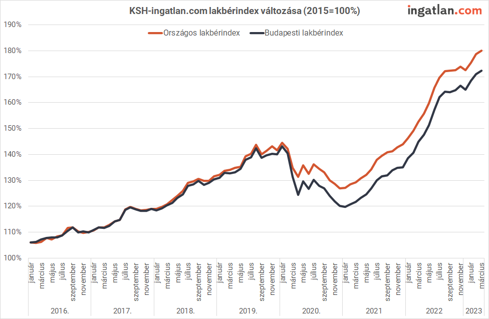 “Éves szinten még mindig két számjegyű a növekedés. Országos szinten 18 százalékos, Budapesten pedig 19 százalékos bérletidíj-emelkedés volt márciusban. Érdemes a többéves időtávra szóló mutatókat is figyelembe venni. A márciusi átlagos bérleti díjak országosan 24, a fővárosban 20 százalékkal haladták meg a 2020 januári rekordszintet, miközben reálértéken, vagyis az inflációs hatással együtt 13 és 15 százalékos csökkenésről beszélhetünk.”