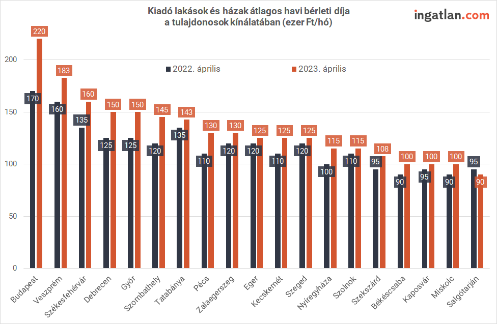 A vármegyeszékhelyek közül április végén Miskolcon, Debrecenben és Szegeden volt a legjelentősebb kínálat albérletekből. Míg a borsodi vármegyeszékhelyen 100 ezer forint az átlagos bérleti díj, a debreceni lakások 150 ezer forintért, a szegediek pedig 125 ezer forintért vehetőek ki. A legdrágább vármegyeszékhely továbbra is Veszprém 182 ezer forintot meghaladó összeggel, a legolcsóbb lakások pedig a salgótarjániak, ezeket 90 ezres átlaggal szerepelnek a kínálatban.