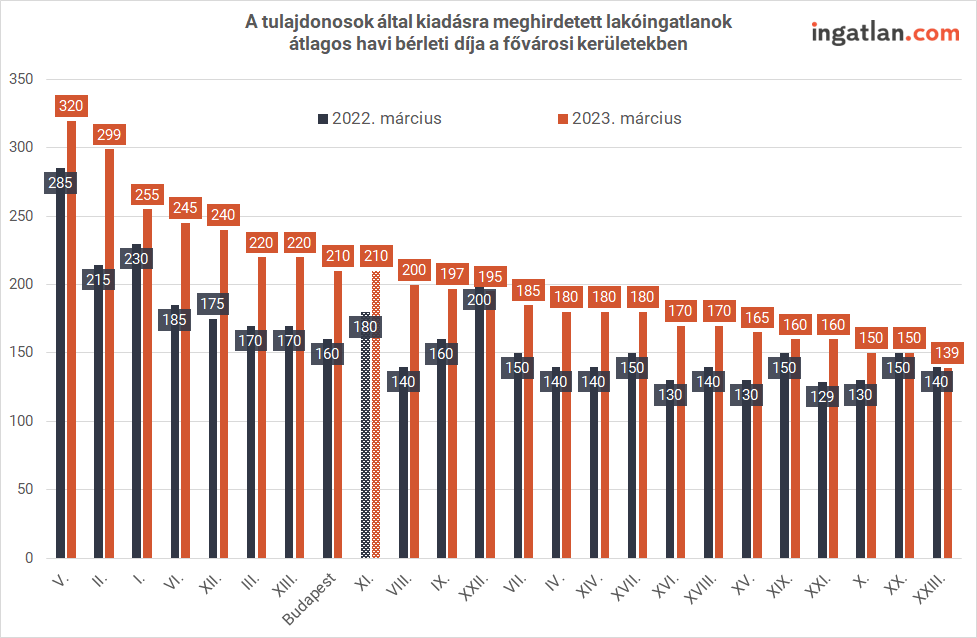 Az ingatlan.com elemzéséből kiderül továbbá, hogy márciusi közepén milyen átlagos bérleti díjak jellemezték a fővárost és a vármegyeszékhelyeket. “Budapesten a kínálati piacon tavaly ősz óta 200 ezer forint volt az átlagos bérleti díj, ami márciusban 210 ezer forintra emelkedett. Az V. kerület 320 ezres összeggel a legdrágább. A legnagyobb kínálatot felvonultató XI. és XIII. kerületben 210 ezer és 220 ezer forintért szeretnék kiadni a lakásukat a tulajdonosok. Budapesten belül 139 ezer és 150 ezer forintos átlaggal továbbra is a XX. és a XXIII. kerület a legolcsóbb.