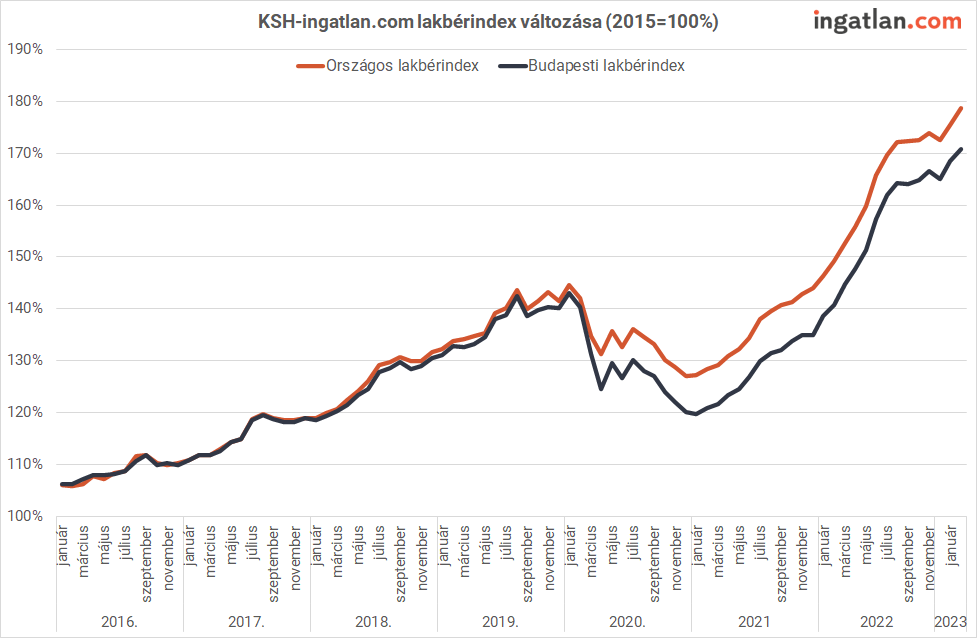 “A fővárosban 1,4 százalékkal, az országos piacon pedig 1,8 százalékkal nőttek a bérleti díjak egy hónap alatt. Ez azonban nem jelent meglepetést. Ahogy arra számítani lehetett az emelkedő bérek megjelentek az albérletpiacon, a minimálbér és a garantált bérminimum is jelentősen emelkedett januártól, ez pedig az átlagfizetéseket is feljebb húzta. A nagyobb fizetéshez pedig februárban jutottak hozzá az érintettek, amivel a lakásukat kiadó tulajdonosok is számoltak. Emellett támogatja a lakbérek emelkedését, hogy a magas lakáshitelkamatok miatt a lakásvásárlást tervezők jelentős része még mindig kivár, akiknek pedig muszáj költözniük, azok közül sokan bérelt lakást keresnek.” – mondta Balogh László, az ingatlan.com vezető gazdasági szakértője. A szakember hozzátette, hogy az idei évben folytatódhat a lakbérek emelkedése, de ennek üteme várhatóan elmarad az infláció mértékétől.