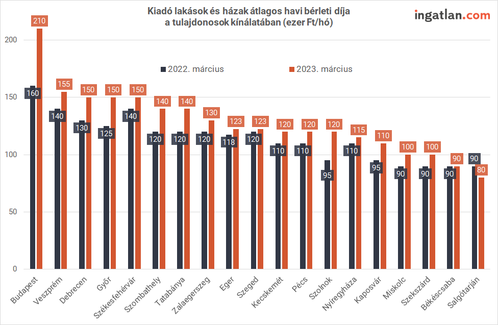A vármegyeszékhelyek között Veszprém a legdrágább 155 ezer forintos átlagos bérleti díjjal. Utána következik Győr, Debrecen és Székesfehérvár egyaránt 150 ezer forinttal. Az is látszik az elemzésből, hogy Debrecen mellett Miskolcon és Szegeden volt a legszélesebb kínálat március közepén, ami nem meglepő, hiszen egyetemvárosokról van szó. A miskolci átlagos bérleti díj 100 ezer, a szegedi 122 ezer forintot tett ki.