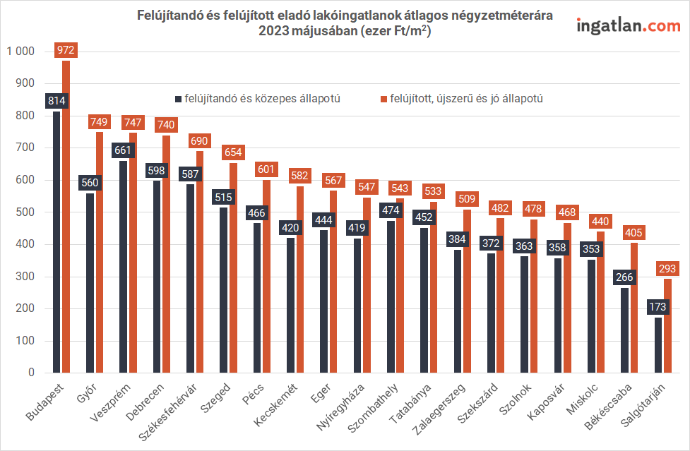 A vármegyeszékhelyeken a felújítandó vagy közepes állapotban lévő lakások esetében 461 ezer forint az átlagos négyzetméterár, miközben a felújított állapotúaknál meghaladja a 600 ezer forintot, azaz utóbbiak 30 százalékkal magasabb áron szerepelnek a kínálatban.
