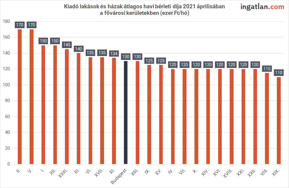 Az elemzésből kiderül, hogy április végén közel 21 ezer kiadó lakás és ház hirdetése szerepelt a kínálatban, ami 10 százalékos növekedésnek felel meg éves szinten. A tulajdonosok által meghirdetett lakóingatlanok átlagos bérleti díja a fővárosban április végén 130 ezer forintot tett ki, a különböző városrészekben azonban eltérőek az árak. Az V. kerület volt ekkor a legdrágább, átlagosan 170 ezer forintos havi bérleti díjjal. A legolcsóbb kerület pedig a XIX., ahol 110 ezer forintért hirdették a kiadó lakásokat. A korábbi években a fővárosi albérletpiacon belül elsősorban a rövid távú lakáskiadás, azaz lakáshotelezés “fellegvárának” számító VI. és VII. kerületben 135 ezer és 120 ezer forintnál tartottak az átlagos bérleti díjak.