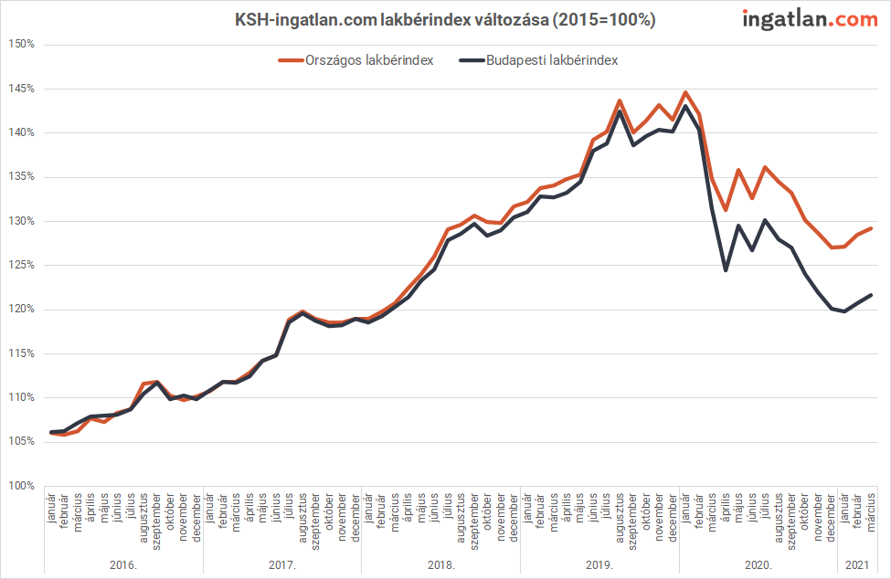 A KSH-ingatlan.com lakbérindexe szerint idén márciusban az előző hónaphoz képest 0,5 százalékkal nőttek a bérleti díjak az országos kínálatban, Budapesten pedig 0,8 százalékos emelkedés történt. “A márciusban bekövetkezett bérletidíj-növekedés minimálisnak tekinthető, továbbra sincs szó tartósabb emelkedésről. Annál is inkább, mert az országos bérleti díjak 1,6 százalékkal, a budapestiek 2,2 százalékkal maradnak el a tavaly áprilisi szinttől, amikor koronavírus-járvány miatt éles fordulatot vett az albérletpiac” – értékelte a legújabb adatokat Balogh László, az ingatlan.com vezető gazdasági szakértője.