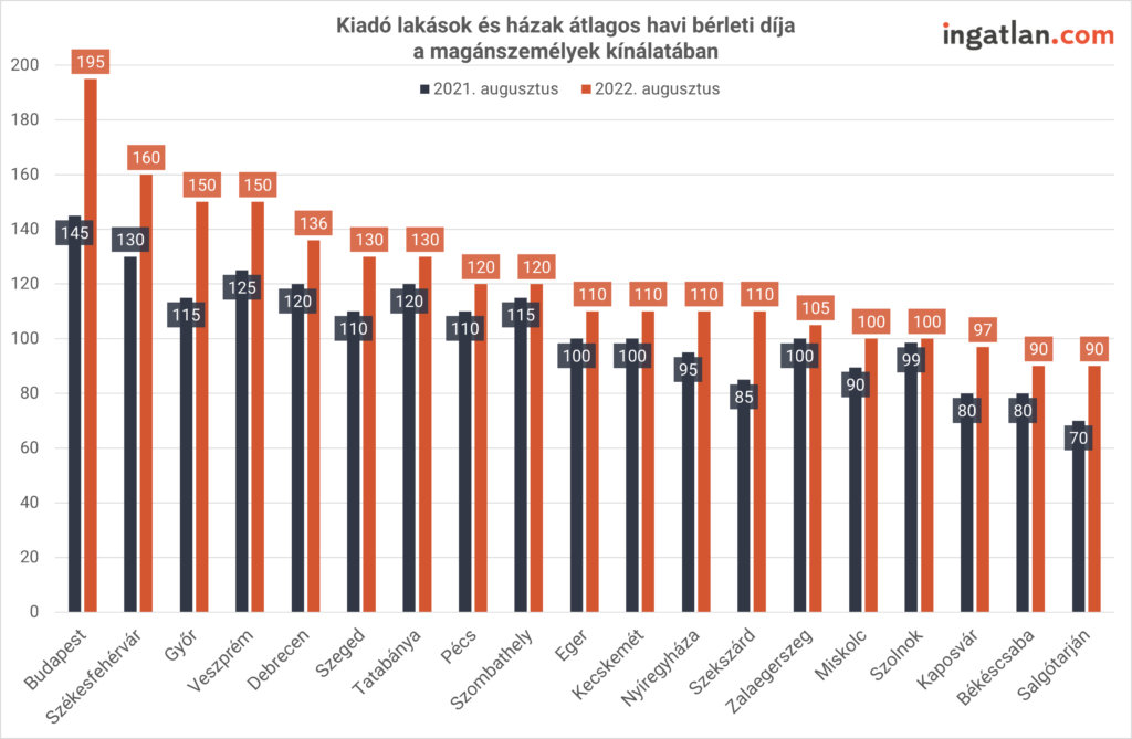 Az átlagos bérleti díjak a budapesti kínálati piacon augusztus közepén 195 ezer forintot tettek ki, szemben az egy évvel korábbi 145 ezer forinttal. Már nyolc kerületben (I., II., III., V., VI., XI., XII., XIII.) legalább 200 ezer forint az átlagos bérleti díj.