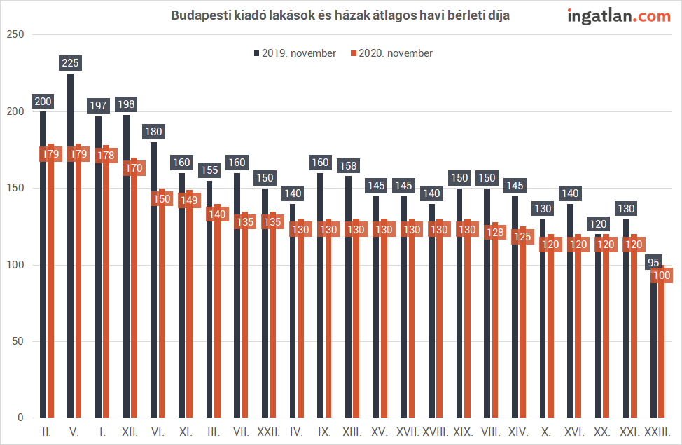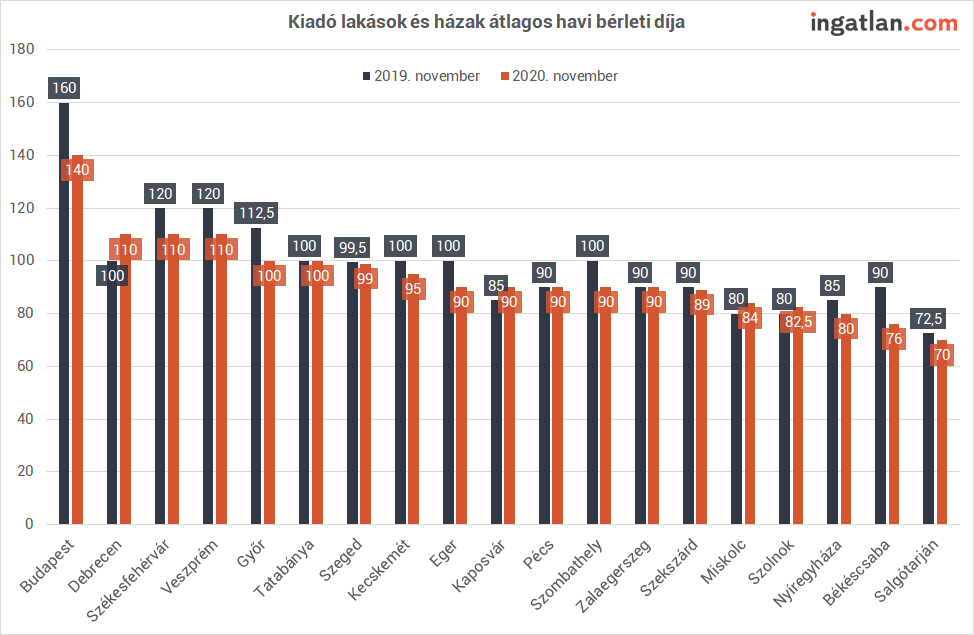 A fővárosban jelenleg átlagosan havi 140 ezer forintért kínálják bérlésre a kiadó lakásokat, ami 15 százalékkal alacsonyabb összeg, mint amit a koronavírus-járvány megjelenése előtt kértek a tulajdonosok. Utoljára 2017 novemberében voltak ilyen alacsonyak az átlagos havi bérleti díjak. A többi egyetemvárosra inkább az árak stagnálása volt jellemző, így Debrecenben most havonta átlagosan 110 ezer, Győrben 100 ezer, Pécsen pedig 90 ezer forintért lehet kibérelni egy lakást. Az olcsóbb egyetemvárosok közé Nyíregyháza, Miskolc és Eger tartozik, ahol 80 ezer, 84 ezer és 90 ezer forint a havi átlagos bérleti díj az ingatlan.com kínálatában.