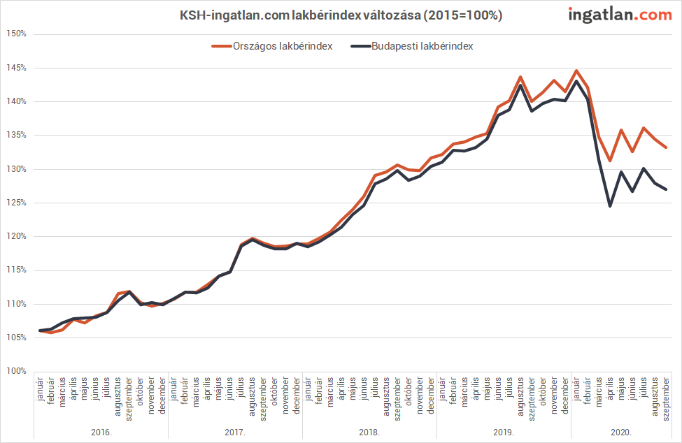 Felemás eredményekkel zárta a szeptembert a magyarországi albérletpiac. Az országszerte bérbe vehető lakások díjainak alakulását ismertető KSH-ingatlan.com lakbérindexből kiderül: idén szeptemberben 5 százalékkal voltak alacsonyabbak az albérletárak az egy évvel korábbinál. “A fővárosban stabilizálnak látszik a 10-15 százalékos éves árcsökkenés, míg az ország többi részében inkább stagnálnak a bérleti díjak éves összevetésben.” – értékelte a legújabb eredményeket Balogh László, az ingatlan.com vezető gazdasági szakértője. A frissen bejelentett, koronavírus-járvány terjedését gátló intézkedések azonban átrajzolhatják az albérletárakat az év hátralévő részében.