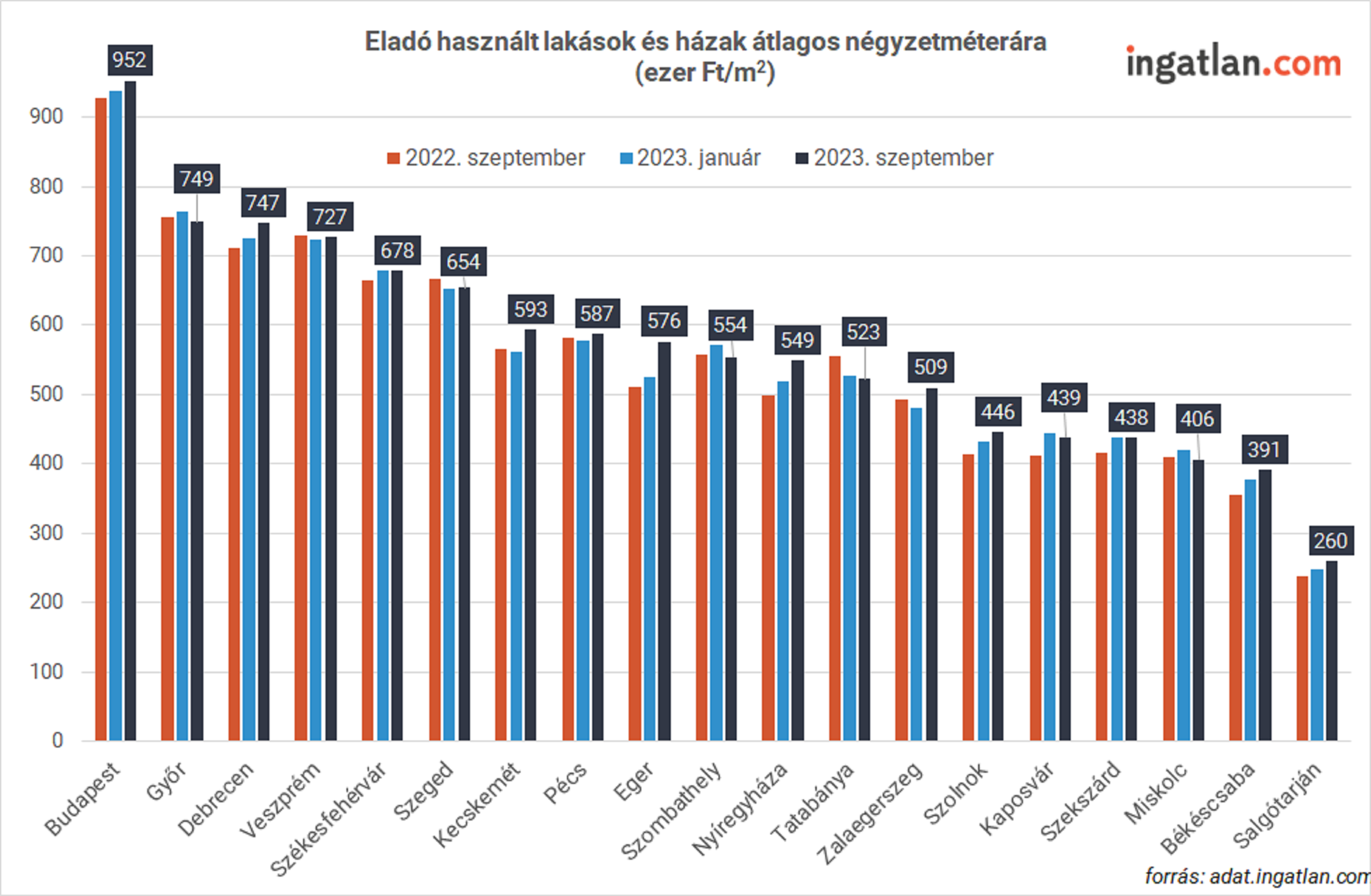 Bár szinte mindenhol stagnáltak az árak, azért akadnak kivételek. Ilyen például Debrecen, ahol minimális drágulás történt január óta az összes lakóingatlan-típus esetében, az átlagos négyzetméterár ugyanis 3 százalékkal 747 ezer forintra emelkedett. A legdrágább vármegyeszékhelyek közé tartozó Győrben ugyanakkor 2 százalékkal 749 ezer forintra csökkent az átlagos négyzetméterár január óta. Székesfehérváron nem történt változás, ez 678 ezer forintos árat jelent. A legolcsóbb vármegyeszékhely Salgótarján, ahol akár fővárosi átlagárak negyedéért, 15 millió forint alatt lehet lakást vásárolni a kínálati árak alapján.